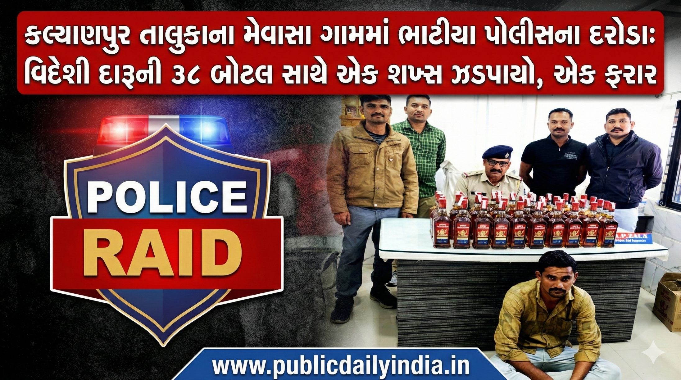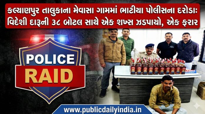 વિગતો મુજબ, ભાટીયા આઉટપોસ્ટના પી.એસ.આઈ. કે.પી. ઝાલાની રાહબરી હેઠળ પોલીસ સ્ટાફ પેટ્રોલીંગમાં હતો ત્યારે હેડ કોન્સ્ટેબલ માલદેભાઈ બરાઈને ચોક્કસ બાતમી મળી હતી. બાતમીના આધારે મેવાસા ગામમાં રહેતા હેમતભાઈ અરશીભાઈ ધ્રાંગુના મકાને દરોડો પાડવામાં આવ્યો હતો. પોલીસ તપાસ દરમિયાન ત્યાંથી ભારતીય બનાવટના વિદેશી દારૂની જુદી-જુદી બ્રાન્ડની કુલ ૩૮ બોટલો મળી આવી હતી, જેની કિંમત રૂપિયા ૪૯,૪૦૦ ગણવામાં આવી છે.