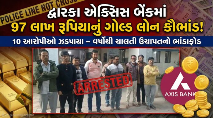 દ્વારકા સ્થિત એક્સિસ બેંકમાં ગોલ્ડ લોન વિભાગમાં 97 લાખ રૂપિયાની ગેરરીતિ સામે આવતા પોલીસ દ્વારા કુલ 10 આરોપીઓને ઝડપી લેવામાં આવ્યા છે. ઓછા કેરેટના સોનાને વધુ કેરેટ બતાવી લોન મંજૂર કરાવવાના કાવતરાનો ભંડાફોડ થયો છે.