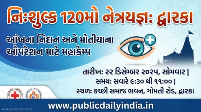 દ્વારકાવાસીઓ માટે તબીબી સેવાના ભાગરૂપે એક નિઃશુલ્ક નેત્ર નિદાન કેમ્પનું આયોજન કરવામાં આવ્યું છે. ઇન્ડિયન રેડક્રોસ સોસાયટી – દ્વારકા, શ્રી રણછોડદાસજી બાપુ ચેરીટેબલ હોસ્પીટલ – રાજકોટ અને માતુશ્રી મોંઘીબેન હ.વિ.ગો.મે. ચે. ટ્રસ્ટ – દ્વારકાના સંયુક્ત ઉપક્રમે તારીખ ૨૨ ડિસેમ્બર ૨૦૨૫ ને સોમવારના રોજ ‘૧૨૦મો નેત્રયજ્ઞ’ યોજાશે. આ કેમ્પ સવારે ૯:૩૦ થી ૧૧:૦૦ વાગ્યા સુધી કચ્છી સમાજ ભવન, રામેરામ ધર્મશાળા પાસે, ગોમતી રોડ, દ્વારકા ખાતે રાખવામાં આવ્યો છે.