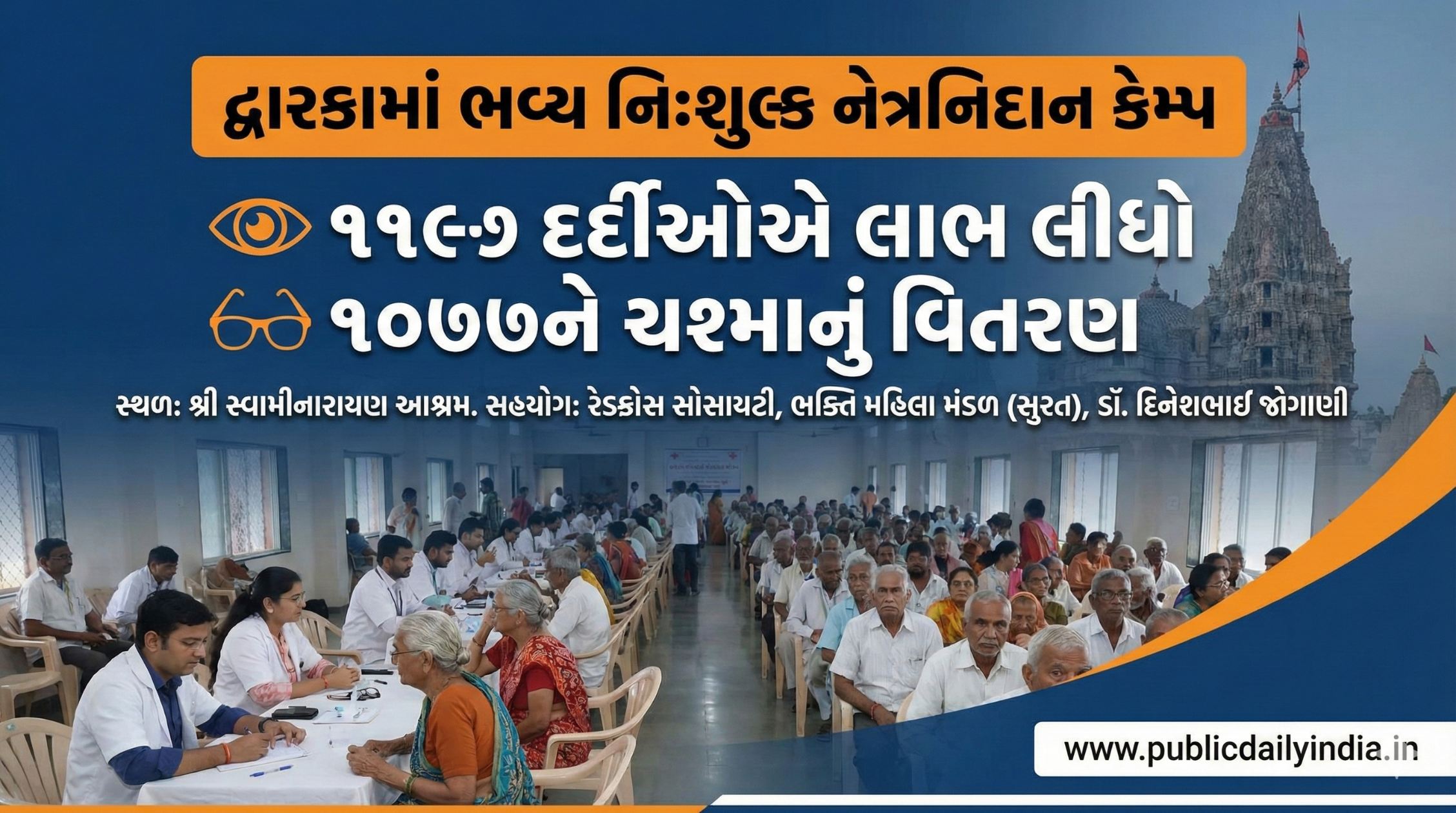 દ્વારકાના શ્રી સ્વામીનારાયણ આશ્રમ ખાતે તાજેતરમાં એક ભવ્ય નિઃશુલ્ક નેત્રનિદાન અને ચશ્માં વિતરણ કેમ્પનું આયોજન કરવામાં આવ્યું હતું. આ માનવસેવાના કાર્યમાં સુરતના અકાળા સ્થિત શ્રી ભક્તિ મહિલા મંડળ, ઇન્ડિયન રેડક્રોસ સોસાયટીની ચોરાસી તાલુકા બ્રાંચ (સુરત) અને ઇન્ડિયન રેડક્રોસ સોસાયટીની દ્વારકા બ્રાંચનો સહયોગ સાંપડ્યો હતો.