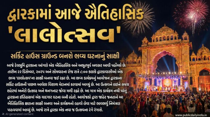 આજે દેવભૂમિ દ્વારકાના આંગણે એક ઐતિહાસિક અને અભૂતપૂર્વ અવસર આવી પહોંચ્યો છે. તારીખ ૨૨ ડિસેમ્બર, ૨૦૨૫ અને સોમવારના રોજ રાત્રે ૮:૦૦ કલાકે દ્વારકાવાસીઓ એક ભવ્ય ‘લાલોત્સવ’ના સાક્ષી બનવા જઈ રહ્યા છે.