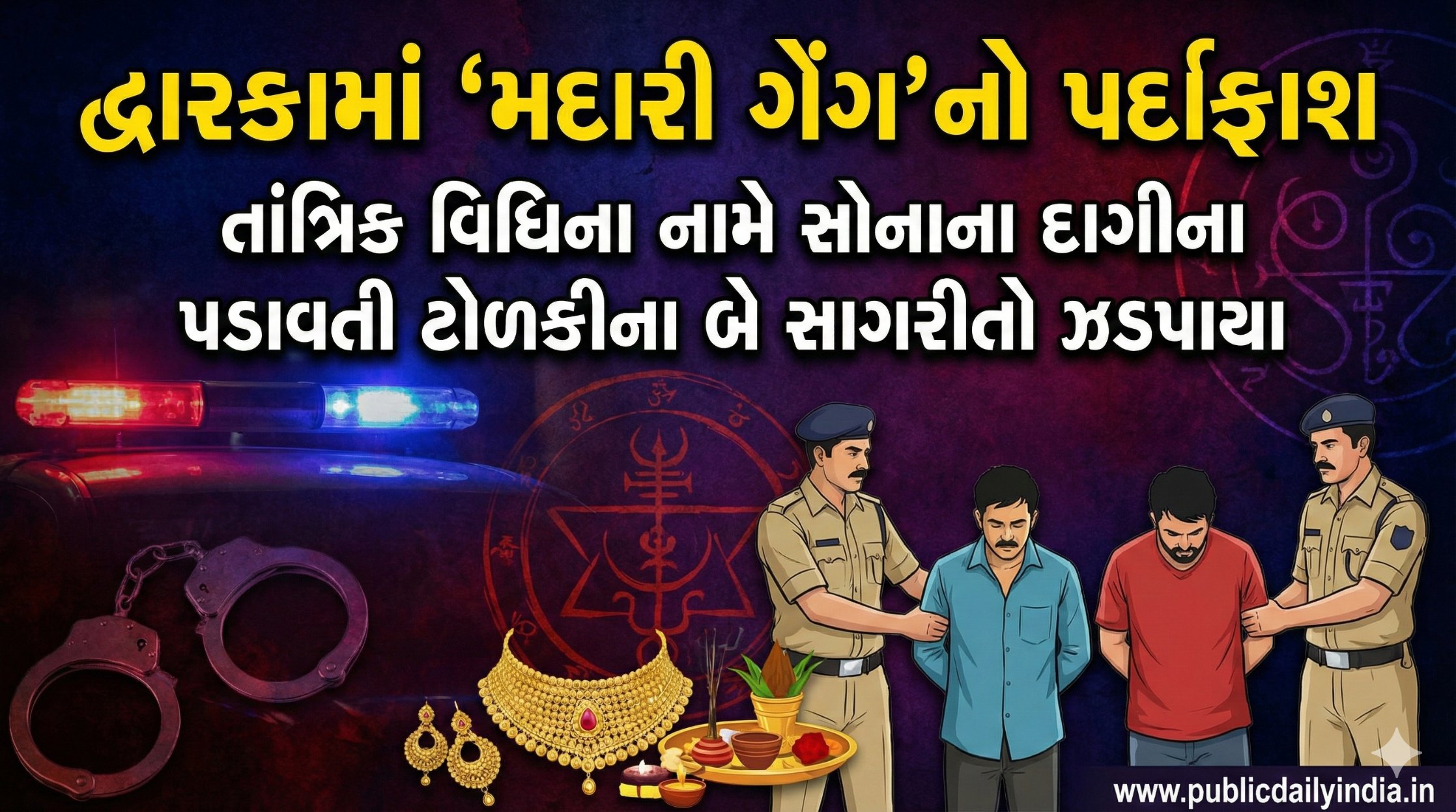 દેવભૂમિ દ્વારકા એલસીબી (LCB) ટીમે એક મોટી સફળતા હાંસલ કરતા તાંત્રિક વિધિના નામે લોકો સાથે છેતરપિંડી કરતી કુખ્યાત ‘મદારી ગેંગ’નો પર્દાફાશ કર્યો છે. ગુજરાતમાં અંધશ્રદ્ધાનો લાભ ઉઠાવીને નાગરિકોને શિકાર બનાવતી ઘટનાઓમાં વધારો થયો છે, ત્યારે દ્વારકા પોલીસે સતર્કતા દાખવીને આ ટોળકીના બે સાગરીતોને ઝડપી લીધા છે અને કાયદેસરની કાર્યવાહી હાથ ધરી છે.