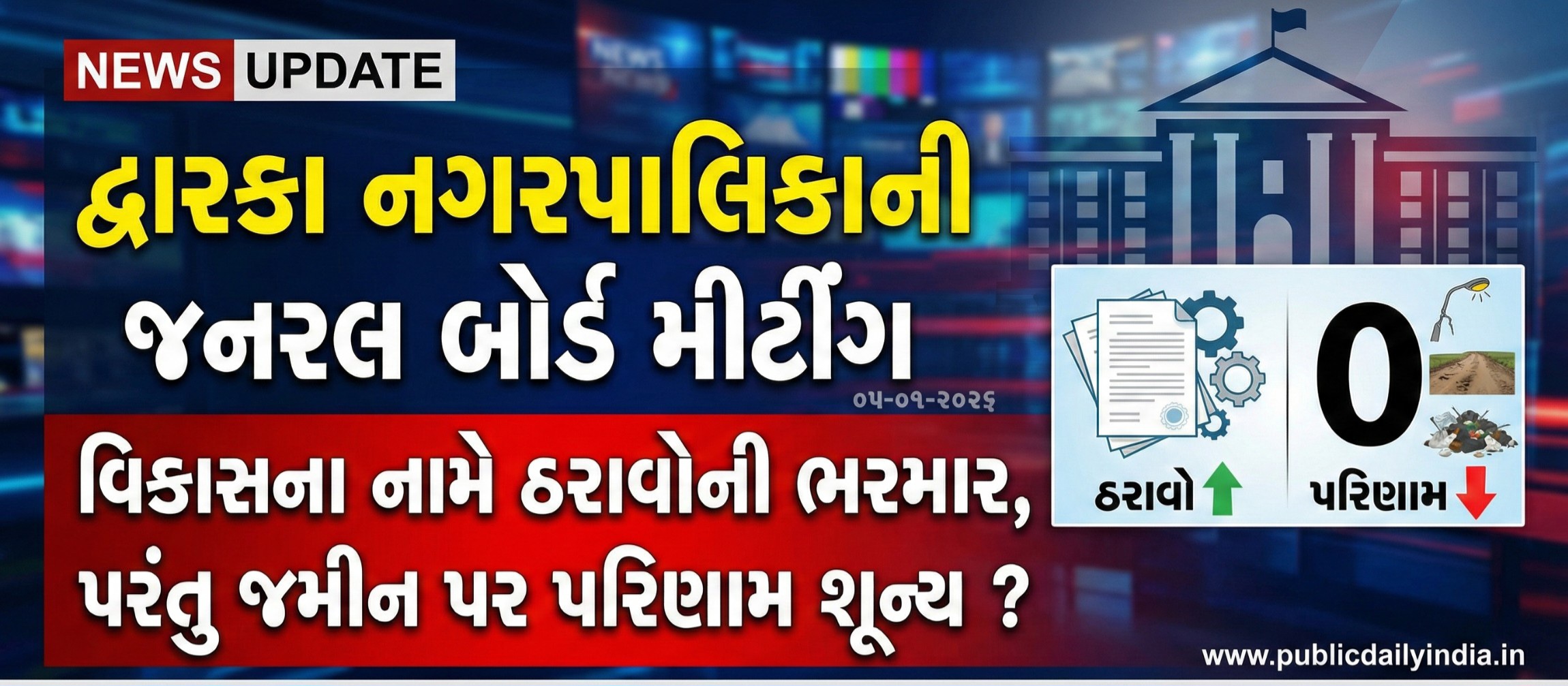 દ્વારકા નગરપાલિકા દ્વારા આગામી તા.૦૫-૦૧-૨૦૨૬ ના રોજ જનરલ બોર્ડ મીટીંગ યોજાવાની જાહેરાત કરવામાં આવી છે, જેમાં દર વખતની જેમ વિકાસલક્ષી ઠરાવોની લાંબી યાદી રજૂ કરવામાં આવશે. પરંતુ સવાલ એ ઊભો થાય છે કે શું આ મીટીંગો માત્ર કાગળ પરની કાર્યવાહી પૂરતી જ રહી જાય છે ?