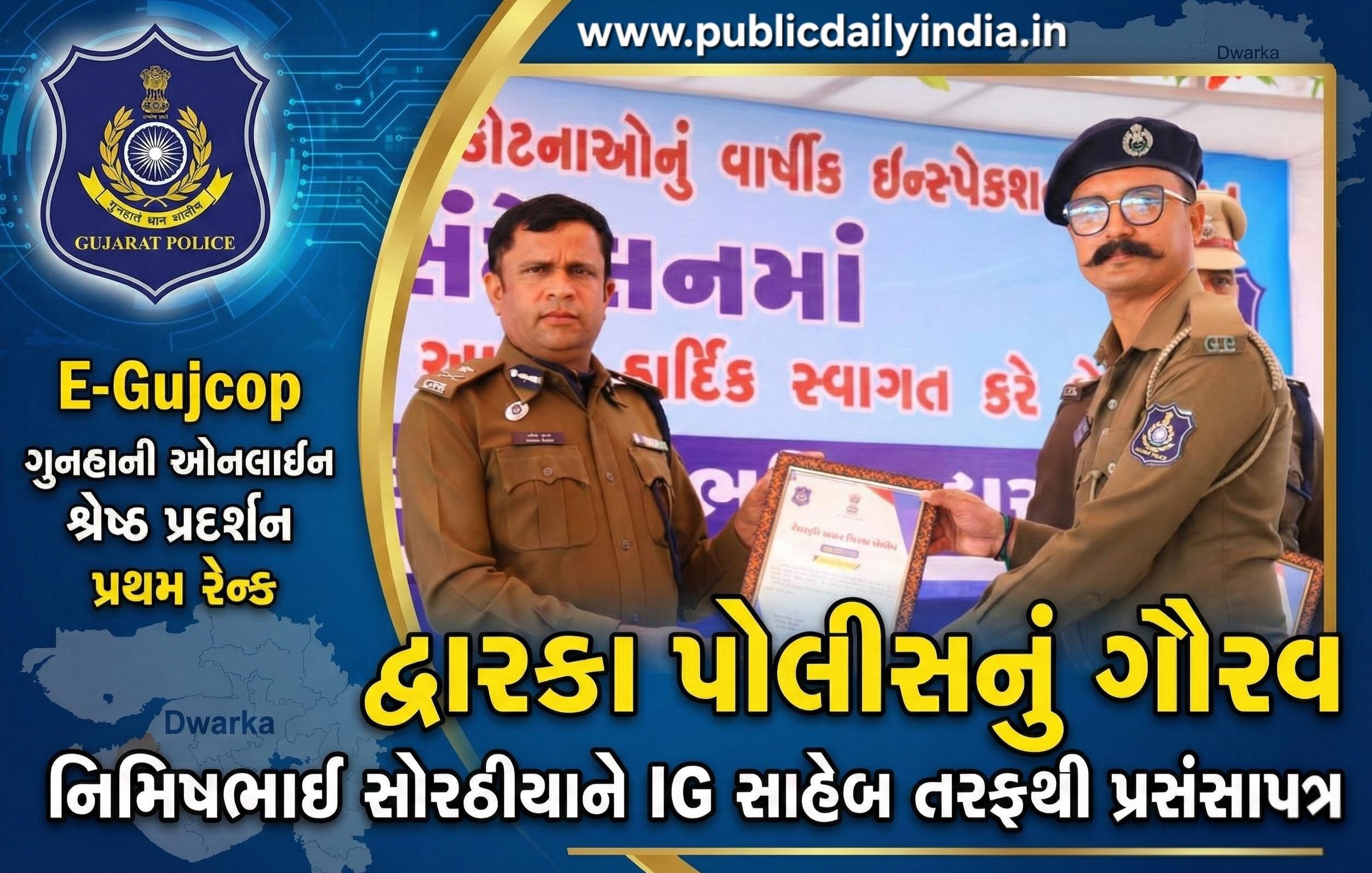 દ્વારકા પોલીસ વિભાગ માટે ગૌરવની ક્ષણ સર્જાઈ છે. દ્વારકા પોલીસ સ્ટેશનમાં ફરજ બજાવતા નિમિષભાઈ લખમણભાઈ સોરઠીયાએ દ્વારકા જિલ્લામાં E-Gujcop તથા ગુનહાની ઓનલાઇન કામગીરીમાં શ્રેષ્ઠ પ્રદર્શન કરી પ્રથમ રેન્ક પ્રાપ્ત કરી છે.