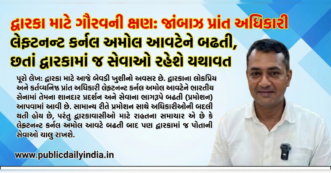 દ્વારકા માટે આજે બેવડી ખુશીનો અવસર છે. દ્વારકાના લોકપ્રિય અને કર્તવ્યનિષ્ઠ પ્રાંત અધિકારી લેફ્ટનન્ટ કર્નલ અમોલ આવટેને ભારતીય સેનામાં તેમના શાનદાર પ્રદર્શન અને સેવાના ભાગરૂપે બઢતી (પ્રમોશન) આપવામાં આવી છે. સામાન્ય રીતે પ્રમોશન સાથે અધિકારીઓની બદલી થતી હોય છે, પરંતુ દ્વારકાવાસીઓ માટે રાહતના સમાચાર એ છે કે લેફ્ટનન્ટ કર્નલ અમોલ આવટે બઢતી બાદ પણ દ્વારકામાં જ પોતાની સેવાઓ ચાલુ રાખશે.