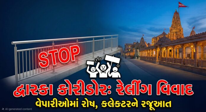 દ્વારકામાં જાહેર રસ્તા પર રેલીંગ લગાવવાના નિર્ણય સામે વેપારીઓમાં અસંતોષ; યોગ્ય ચર્ચા વગર નિર્ણય ન લેવાય તેની કલેક્ટરને વિનંતી.