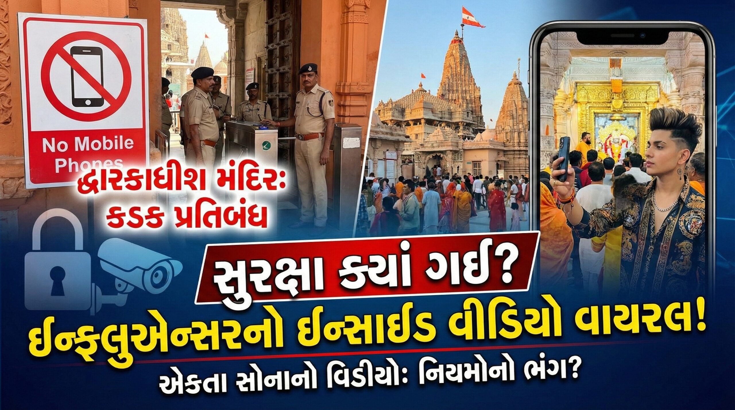 દ્વારકાધીશ મંદિરમાં મોબાઇલ લઈ જવા કડક પ્રતિબંધ હોવા છતાં ઇન્ફ્લુએન્સર એકતા સોના નો ઇન્સાઈડ વીડિયો વાયલ થતાં સુરક્ષા અને નિયમોની અમલવારી પર ગંભીર પ્રશ્નો ઉઠ્યા છે.