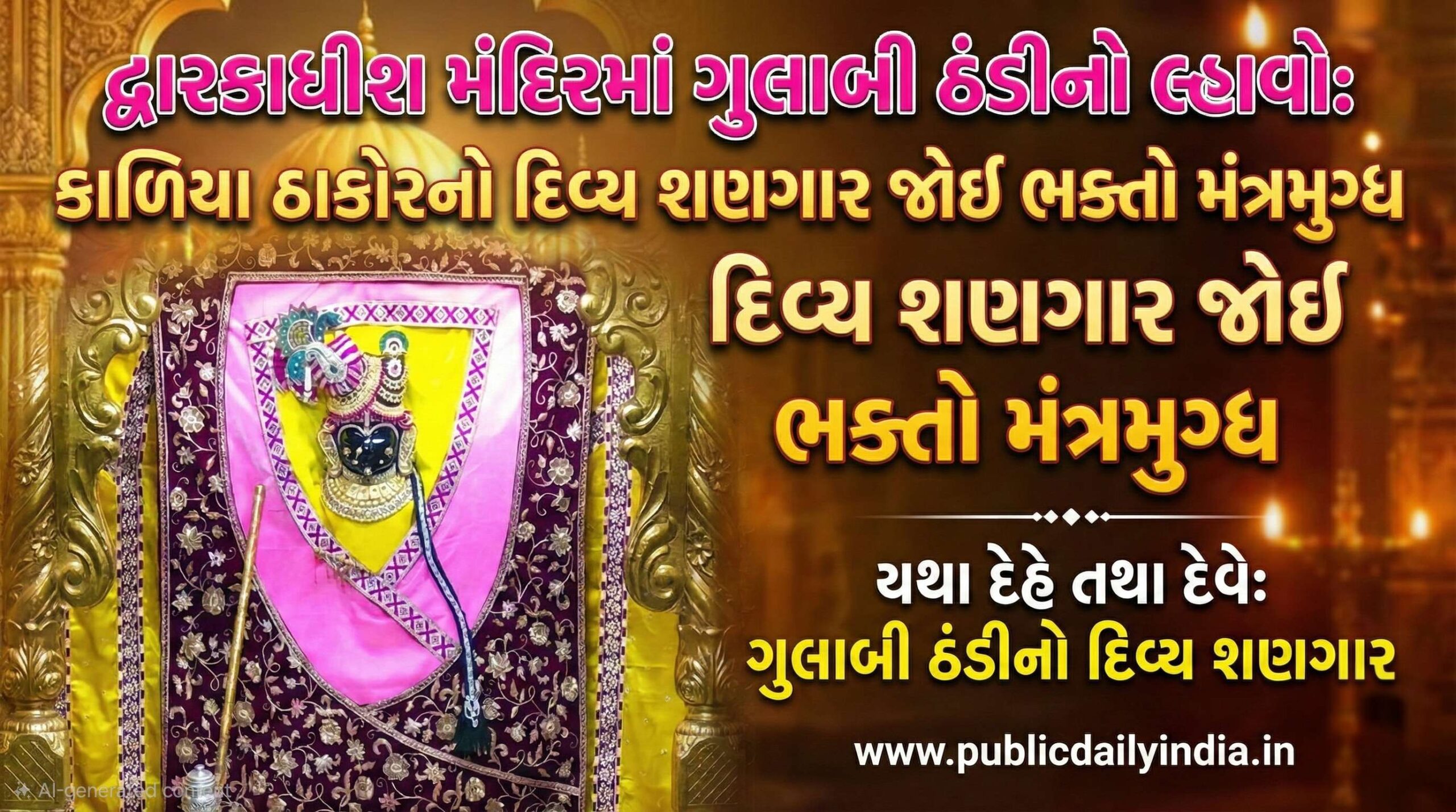 યાત્રાધામ દ્વારકામાં શિયાળાની ગુલાબી ઠંડીનું આગમન થતાં જ જગતમંદિરમાં બિરાજમાન ભગવાન દ્વારકાધીશની સેવા-પૂજામાં પણ ઋતુને અનુરૂપ ફેરફારો જોવા મળ્યા છે. “યથા દેહે તથા દેવે”ની ઉક્તિ સાર્થક કરતા હોય તેમ, પ્રભુને ઠંડીથી રક્ષણ આપવા માટે વિશેષ ગરમ વસ્ત્રો પરિધાન કરાવવામાં આવ્યા હતા.
