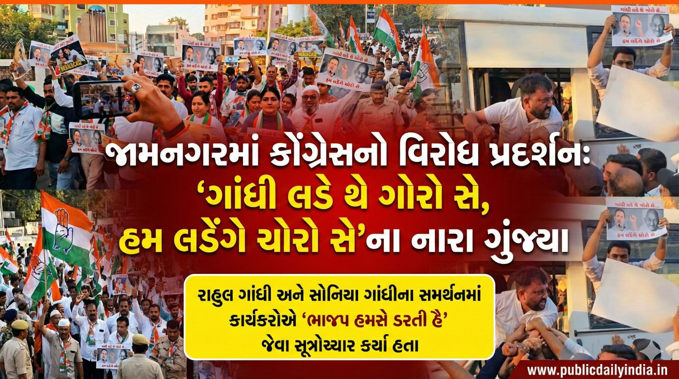 આ વિરોધ પ્રદર્શન દરમિયાન કોંગ્રેસના આગેવાનો અને કાર્યકરોએ ‘ગાંધી લડે થે ગોરો સે, હમ લડેંગે ચોરો સે’ અને ‘ભાજપ હમસે ડરતી હૈ, પોલીસ કો આગે કરતી હૈ’ જેવા નારાઓ લગાવીને વાતાવરણ ગજવી મૂક્યું હતું. કોંગ્રેસનો આક્ષેપ છે કે શાસક પક્ષ દ્વારા વિપક્ષી નેતાઓ, ખાસ કરીને રાહુલ ગાંધી અને સોનિયા ગાંધીને નિશાન બનાવવામાં આવી રહ્યા છે.