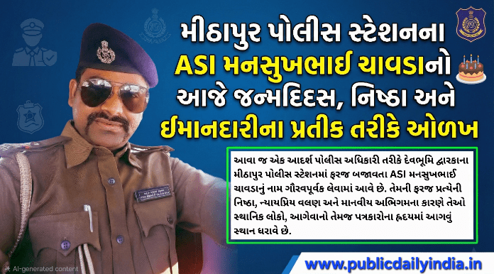 આવા જ એક આદર્શ પોલીસ અધિકારી તરીકે દેવભૂમિ દ્વારકાના મીઠાપુર પોલીસ સ્ટેશનમાં ફરજ બજાવતા ASI મનસુખભાઈ ચાવડાનો આજે જન્મદિવસ ઉજવાઈ રહ્યો છે. તેમની ફરજ પ્રત્યેની નિષ્ઠા, ન્યાયપ્રિય વલણ અને માનવીય અભિગમના કારણે તેઓ સ્થાનિક લોકો, આગેવાનો તેમજ પત્રકારોના હ્રદયમાં આગવું સ્થાન ધરાવે છે.