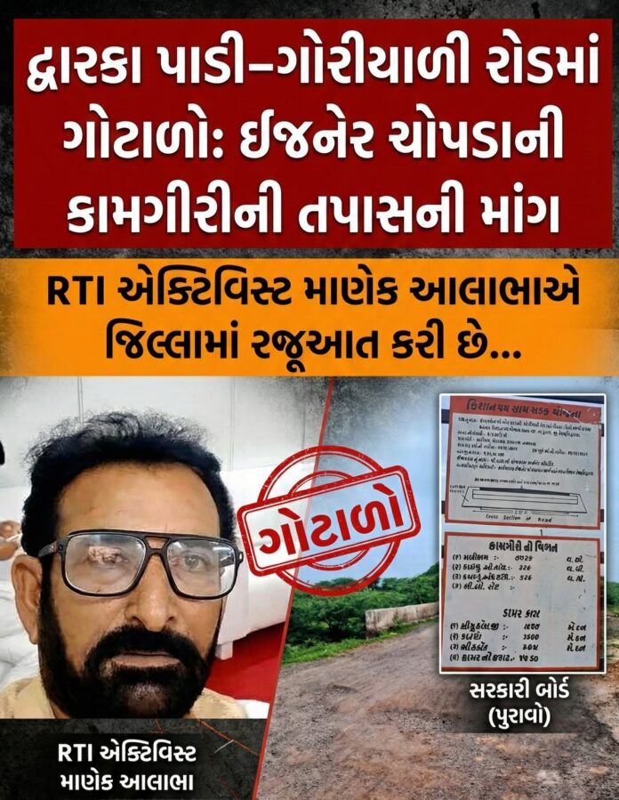 RTI એક્ટિવિસ્ટ માણેક આલાભાએ જિલ્લામાં રજૂઆત કરી છે કે પાડી–ગોરીયાળી રોડ સંબંધી ગોટાળાની વિગતવાર તપાસ થઈ જોઈએ. તેમણે ઈજનેર ચોપડા સામે કામગીરી, વર્તન અને નિર્ણયપ્રણાલી અંગે પ્રશ્નો ઉઠાવ્યા છે.