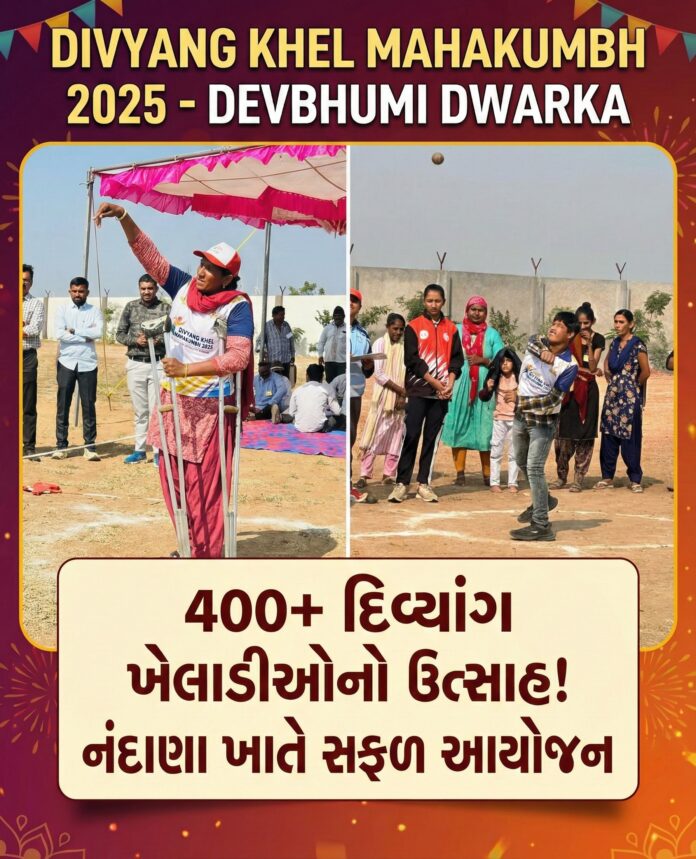 દેવભૂમિ દ્વારકા જિલ્લાના નંદાણા ગામે યોજાયેલા સ્પેશિયલ ખેલ મહાકુંભ 2025 માં 400 થી વધુ દિવ્યાંગ ખેલાડીઓએ ભાગ લઇ પ્રભાવશાળી પ્રદર્શન કર્યું.