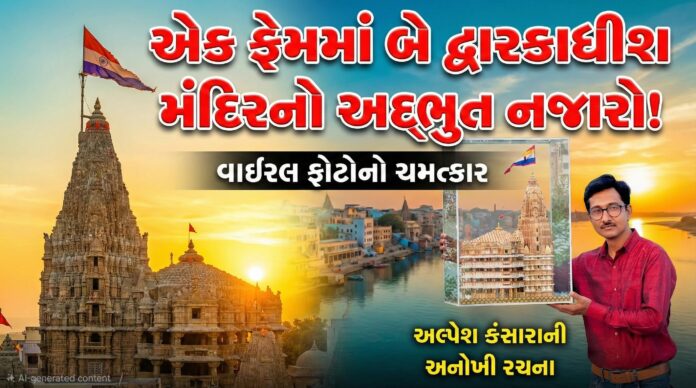 દ્વારકામાં વરવાળાના અલ્પેશ કંસારાએ એક એવી તસવીર કેદ કરી જેમાં અસલી દ્વારકાધીશ મંદિર અને તેની સાથે જ બીજી અનોખી પ્રતિમા એક જ ફ્રેમમાં દેખાઈ આવે છે. સોશિયલ મીડિયામાં આ તસવીર ભારે વાયરલ બની છે.
