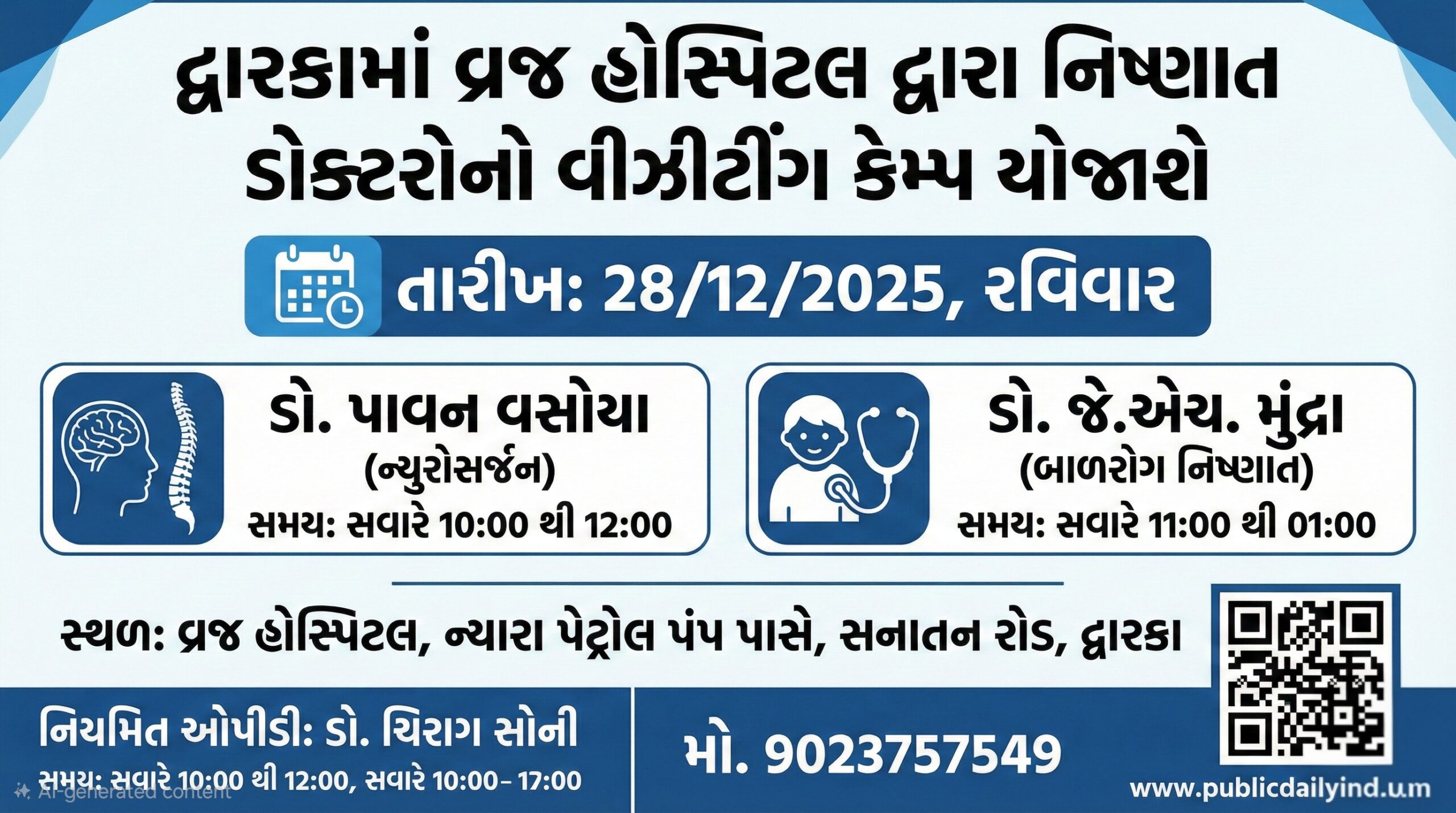 યાત્રાધામ દ્વારકામાં આવેલી વ્રજ હોસ્પિટલ દ્વારા આગામી તારીખ 28/12/2025ને રવિવારના રોજ એક ખાસ વીઝીટીંગ કેમ્પનું આયોજન કરવામાં આવ્યું છે. આ કેમ્પમાં મગજ, મણકા અને કરોડરજ્જુના નિષ્ણાત ન્યુરોસર્જન ડો. પાવન વસોયા (DR.N.B., NEUROSURGEN) સવારે 10:00 થી 12:00 વાગ્યા સુધી સેવા આપશે.