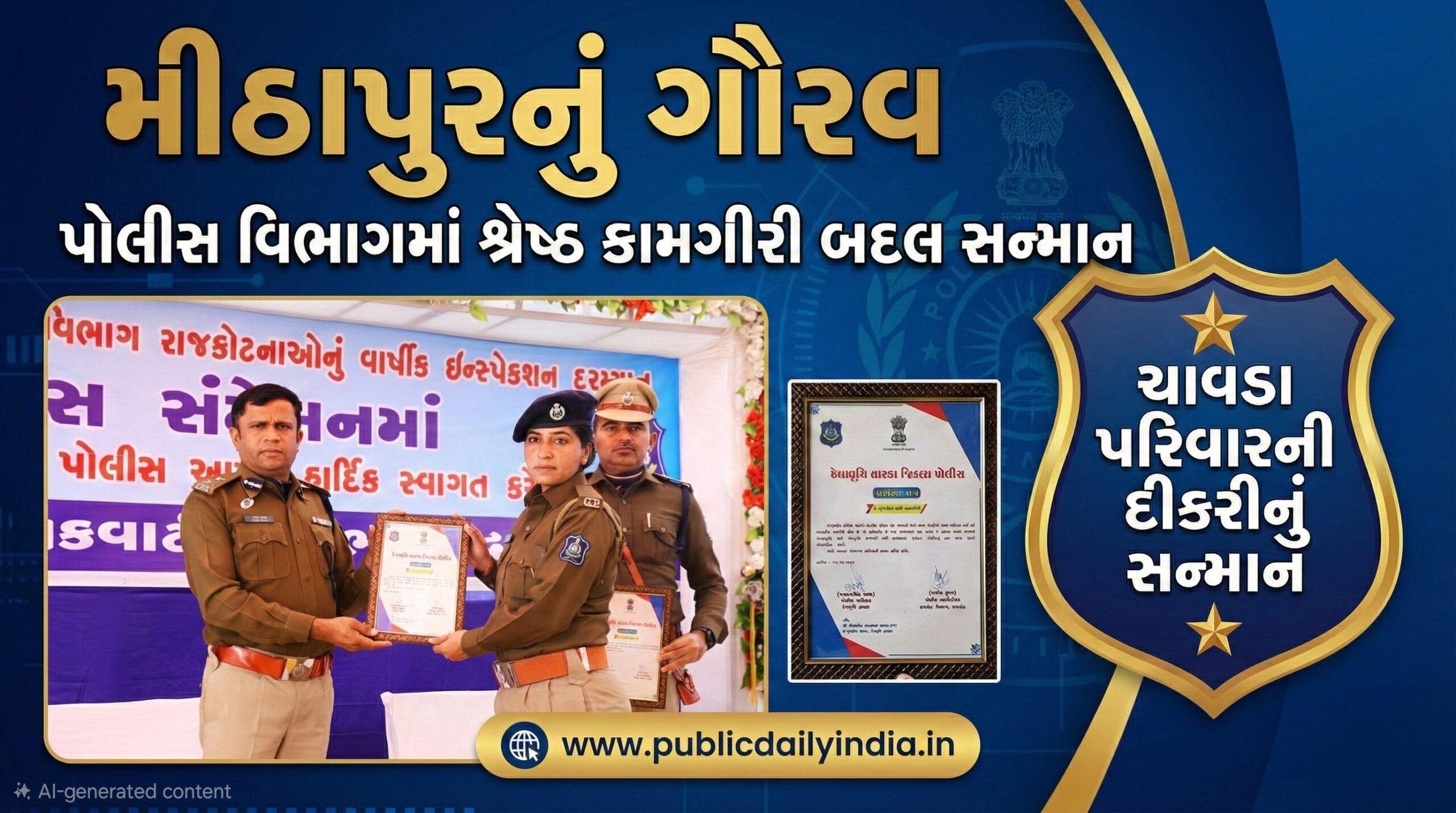 આજરોજ રાજકોટ વિભાગના પોલીસ મહાનિરીક્ષક (IG) શ્રી અશોક કુમાર સાહેબ અને દેવભૂમિ દ્વારકા જિલ્લા પોલીસ અધિક્ષક (SP) શ્રી જયરાજસિંહ વાળા સાહેબના વરદ હસ્તે મિતલબેનને સન્માનિત કરવામાં આવ્યા હતા. આ ગૌરવપૂર્ણ સિદ્ધિ બદલ ચાવડા પરિવાર તેમજ સમગ્ર મીઠાપુરવાસીઓમાં અનેરો ઉત્સાહ અને હર્ષની લાગણી જોવા મળી રહી છે.